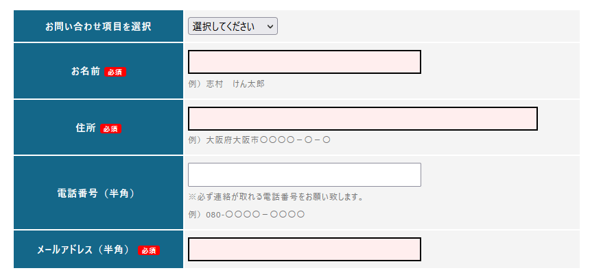 <td><input class="col2 required" type="text" name="ご住所"><br><span class="rei">例)大阪府大阪市〇〇〇〇-〇-〇</span></td>
