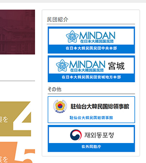 <li><a href="https://overseas.mofa.go.kr/jp-sendai-ja/index.do" target="_blank" rel="noopener"><img src="https://akita-mindan.org/wp/wp-content/plugins/my-snow-monkey/img/link4.gif" alt="駐仙台大韓民国総領事館" />駐仙台大韓民国総領事館</a></li>