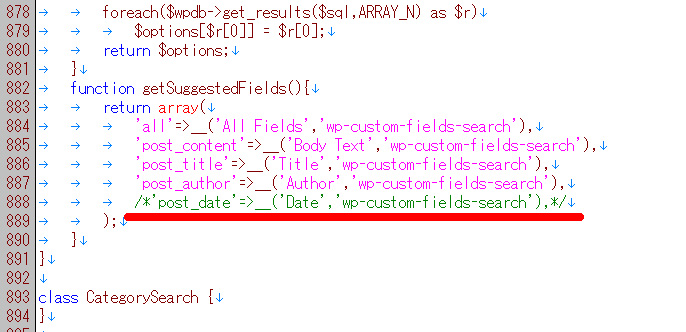 プラグインフォルダ内にextra_search_fields.phpがあるはずなので、中の888行目を消すと解決です。